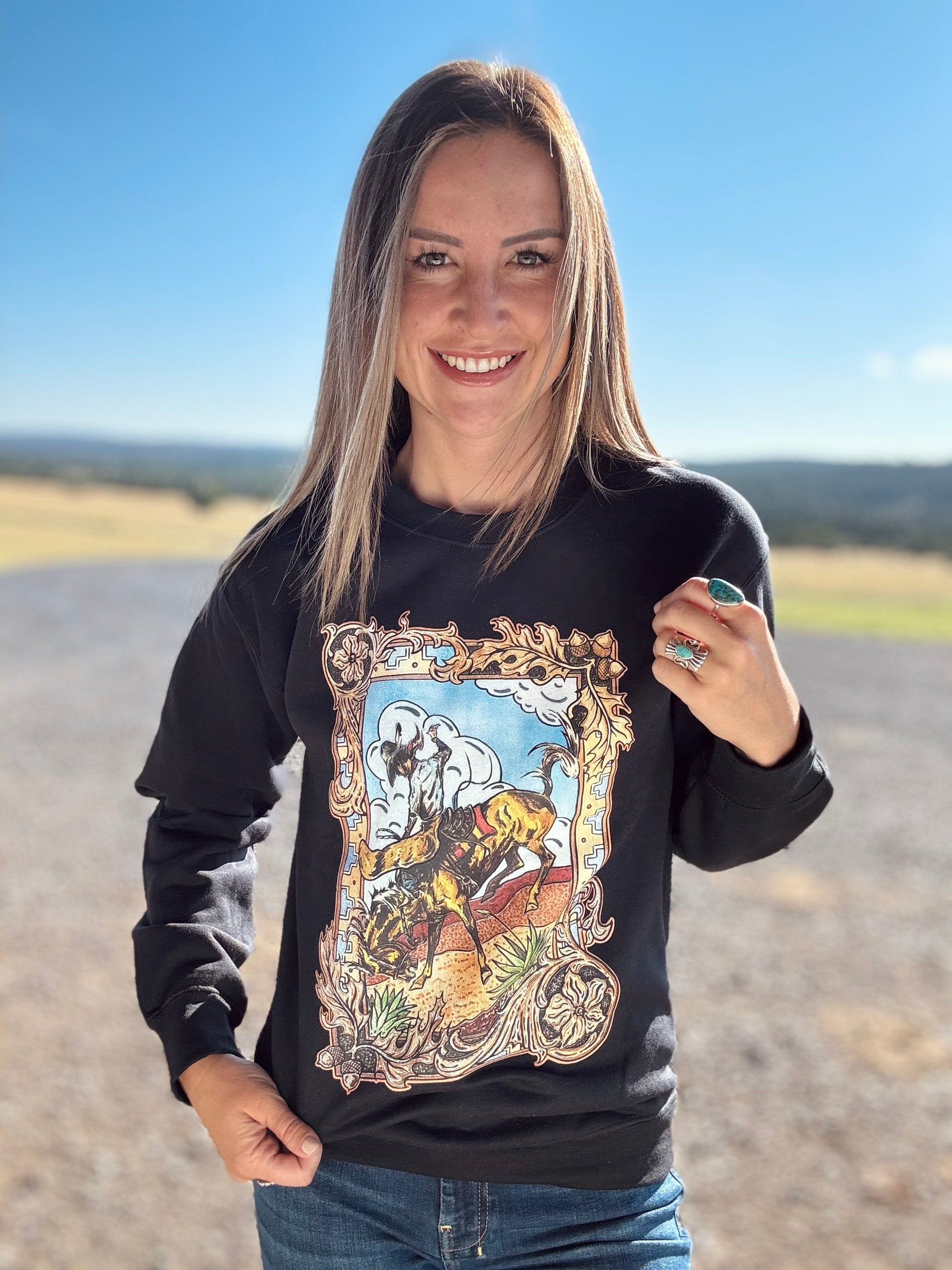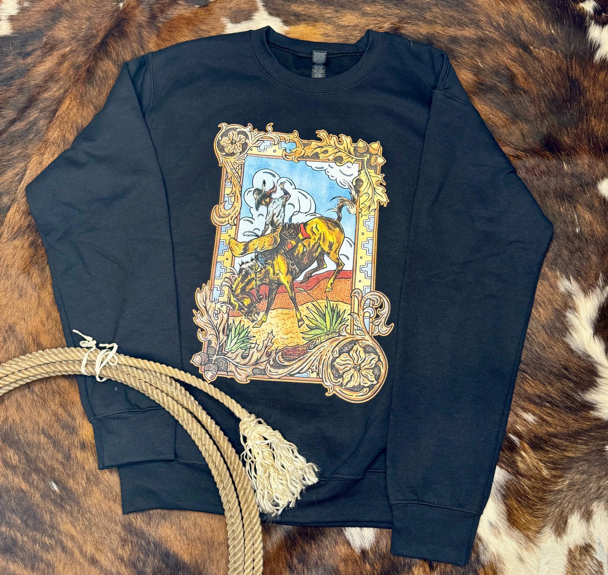 Stay warm with this beautiful, black pullover featuring the beautiful tooled border of a bucking horse with a classic western scene. Perfect addition to your fall and winter wardrobe!