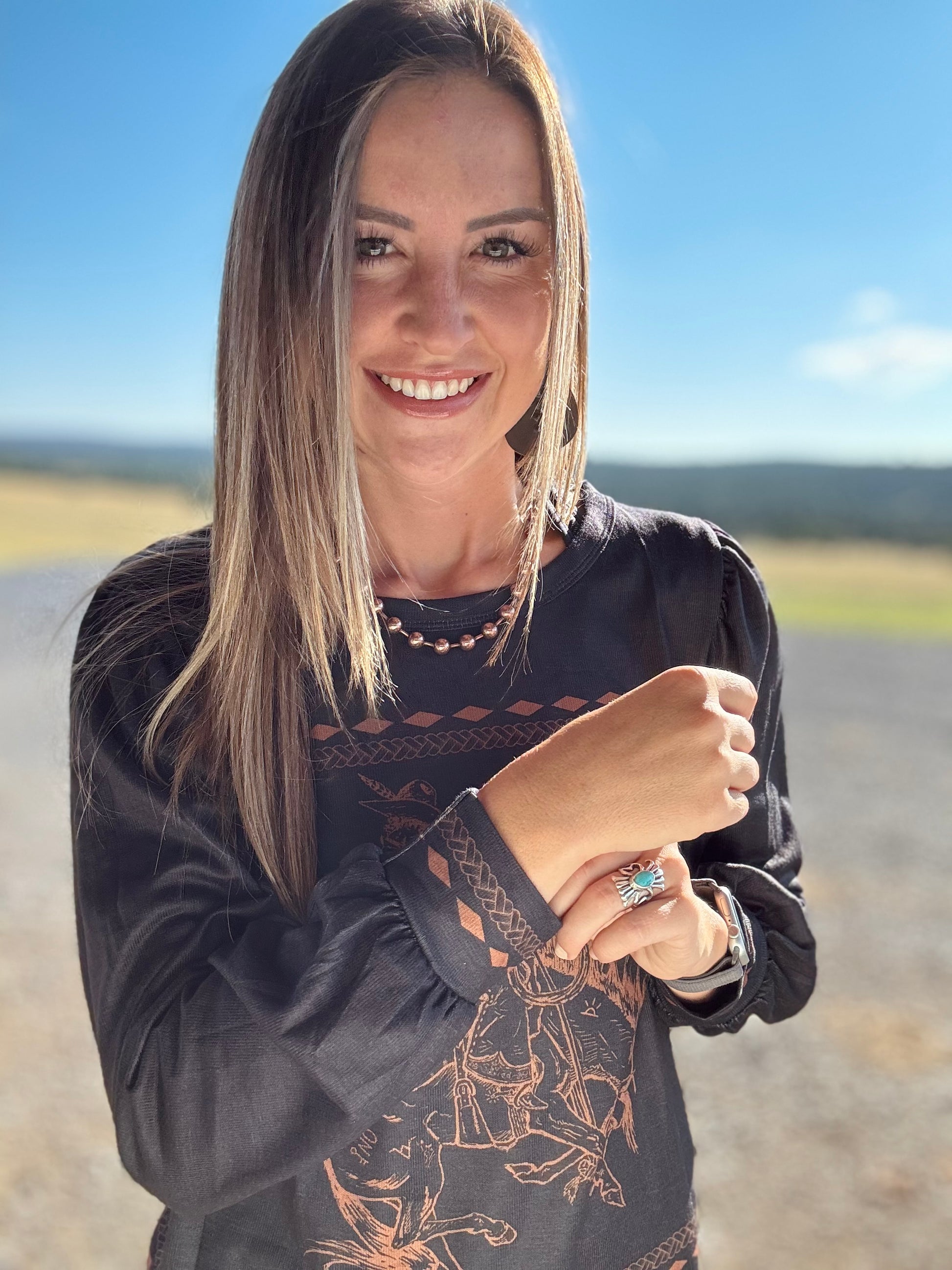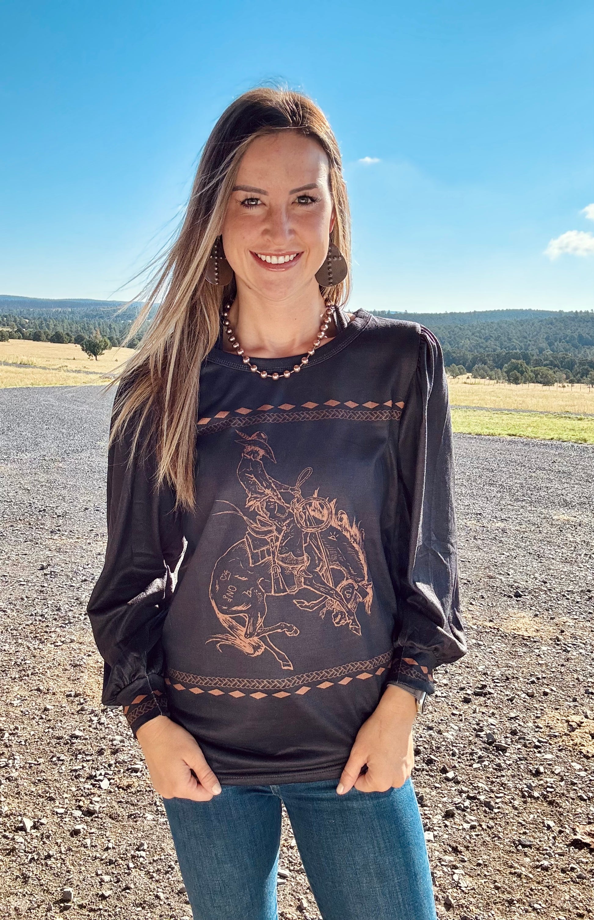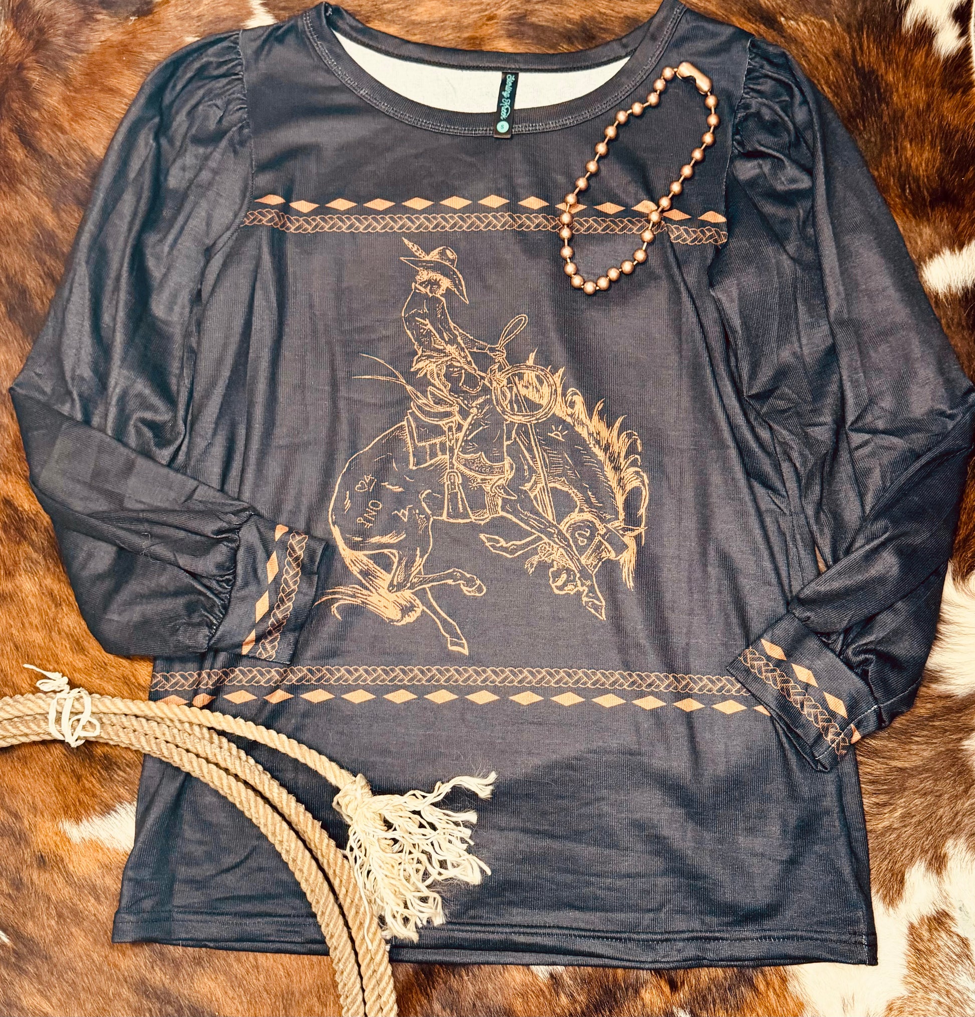 Show off some western flair with this very fun top. Long sleeve, knit top with a beautiful brown cowboy design. This top has sleeve designs that just add that much more and complete the look.